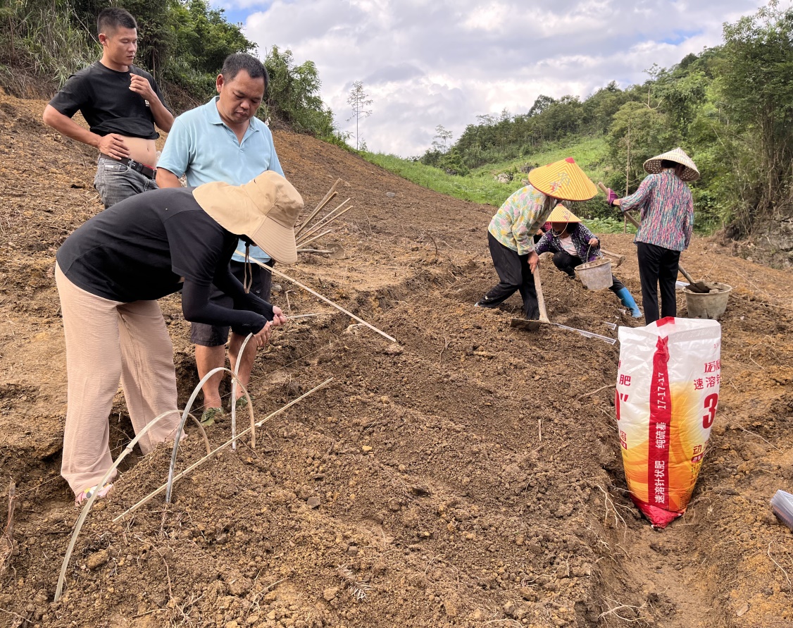 受中药材价格波动影响,环江县部分农户寻求进行种植结构调整,为了帮助当地农户掌握先进的山药栽培技术,肖冬副教授一行驱车290多公里,为环江县川山镇木论社区的山药意向种植农户送去了200余斤山药种子、1000个定向槽和竹条等农资,并在当地开展反季节山药的小拱覆膜栽培技术试种示范。肖冬副教授详细介绍了山药种植的关键技术,包括搭架方式、病虫害防治及合理施肥等方面的知识。针对农户们在实际种植中遇到的具体问题,团队进行了现场答疑,农户们表现出了浓厚的兴趣。