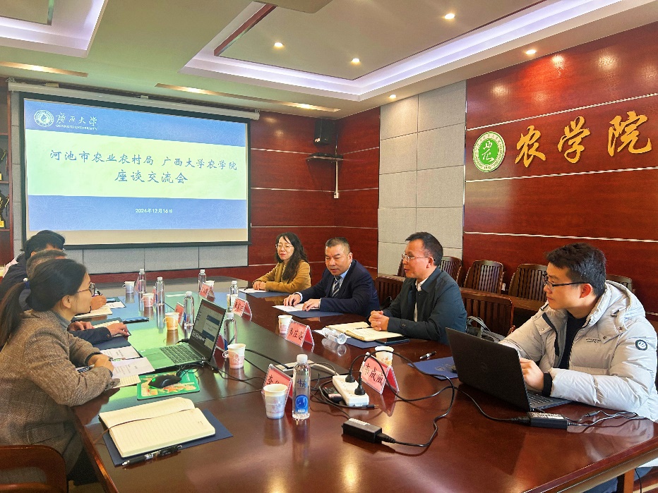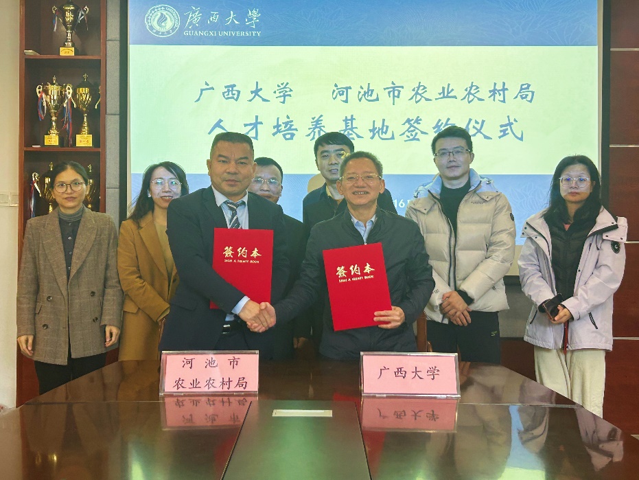 2024年12月16日上午,我院与河池市农业农村局举行人才培养工作座谈会并签署合作备忘录。河池市委农办主任、河池市农业农村局党组书记、局长覃家旺,河池市农业农村局副局长韦庄备;农公司党委书记袁涛,农公司党委副书记甘敏思、太阳成集团tyc122cc副经理韦燕燕出席座谈会暨签约仪式。农公司党委书记袁涛、河池市委农办主任覃家旺分别代表双方签约。