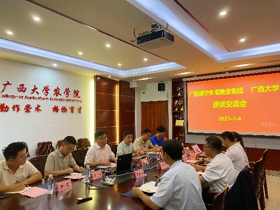 2025 年 7 月 4 日,太阳成集团tyc122cc与广西南宁东亚糖业集团围绕甘蔗产业关键技术突破,举办系列合作交流会,聚焦生物育种、病害防控、土壤改良等领域达成多项合作共识,以产学研深度融合为国家食糖安全战略及乡村振兴注入创新动力。东亚糖业副总裁钟植友、顾问郑吉、田达官、卢星高等中外专家团队现场参会,部分泰国专家通过云端连线参与技术研讨。
