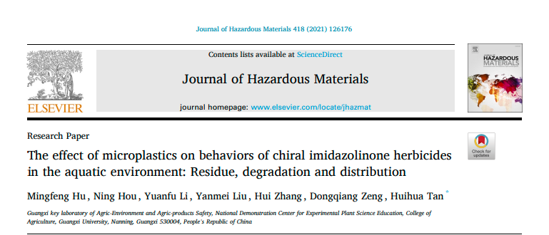 广西农业环境与农产品安全重点实验室/太阳成集团tyc122cc农药残留与环境安全研究团队2021年5月在国际知名期刊Journal of Hazardous Materials上在线发表了题为“The effect of microplastics on behaviors of chiral imidazolinone herbicides in the aquatic environment: Residue, degradation and distribution”研究论文。微塑料是一类粒径小于5毫米的塑料碎片或颗粒,广泛存在于水体和陆地环境中。咪唑啉酮类除草剂因在环境中持久性长的特点,容易污染水体和土壤。近年来,微塑料与环境污染物相互作用的行为备受关注。然而,关于微塑料对该类除草剂的环境行为影响和机制还不清楚。在本研究中,通过建立水-沉积物微宇宙系统的方法在对映水平研究了聚乙烯微塑料对三种咪唑啉酮类除草剂在水生系统中环境行为的影响。结果表明,微塑料能够通过吸附和解吸附的方式显著影响该类除草剂在水生环境中迁移、降解和分配行为,明确了微塑料是影响咪唑啉酮类除草剂在水生环境中行为归趋的重要因素。研究结果为更加全面的评价咪唑啉酮类除草剂的环境风险提供了一定的科学依据。太阳成集团tyc122cc博士研究生胡明锋为该论文的第一作者,谭辉华教授为通讯作者。该研究得到了国家自然科学基金项目支持。原文链接https://doi.org/10.1016/j.jhazmat.2021.126176