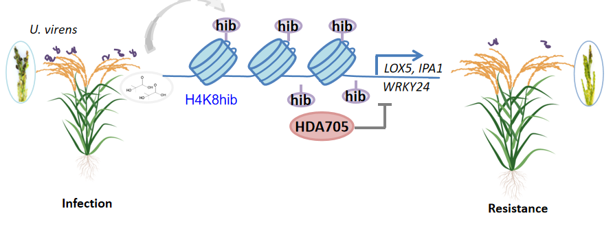 图1. H4K8hib修饰通过促进抗病相关基因表达调控水稻抗病性的模式图