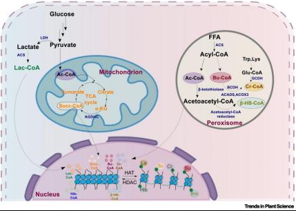 组蛋白甲基化和乙酰化是经典的表观遗传标记,在调控染色质结构和基因表达中发挥核心作用。近年来,随着高分辨质谱技术的快速发展,组蛋白赖氨酸残基上陆续发现多种新型短链酰基化修饰,包括巴豆酰化(Kcr)、丁酰化(Kbu)、β-羟基丁酰化(Kbhb)、2-羟基异丁酰化(Khib)、琥珀酰化(Ksu)和乳酸化(Kla)等。这些新型修饰的发现大大丰富了组蛋白翻译后修饰的类型,也为深入理解表观遗传调控机制提供了新的视角。这些短链酰基化修饰主要由组蛋白酰基化转移酶(Writers)催化和组蛋白去酰基化酶(Erasers)动态调控。动物研究表明,这些酰基辅酶A通常来源于特定的代谢途径;而在植物中,尽管多种酰基供体的具体代谢来源尚不完全清楚,但现有证据显示,它们可能来自脂肪酸β-氧化、三羧酸循环(TCA)以及糖酵解等途径(图1)。